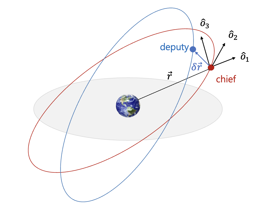 여기서 \( (e_x, e_y) \) 를 이심율 벡터 (eccentricity vector) \(\vec{e}\) 의 구성 요소, \(u=\omega+M\) 을 mean argument of latitude 라고 한다. 이제 두 위성(chief 와 deputy) 간의 거리 벡터 \(\delta \vec{r}\) 과 궤도요소에 대한 관계식을 알아보도록 한다.