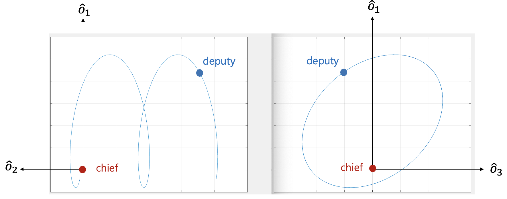 chief 위성과 deputy 위성 간의 \(\hat{o}_2\) 축(along-track) 상의 거리가 계속 증가하는데 그 이유는 식 (1)에서 \(\delta a\) 항 때문이다. 두 궤도 사이에서 \(\delta a\) 가 \(0\) 이 아닌 경우 궤도 주기가 다르기 때문에 두 궤도의 거리는 점차 멀어지게 된다. \(\delta a=0\)인 경우로 제한할 경우 Hill 좌표계의 \(\hat{o}_1-\hat{o}_2\) 평면(in-plane)과 \(\hat{o}_1-\hat{o}_3\) 평면(out-of-plane)에서 두 위성의 상대 운동을 나타내면 다음 그림과 같다.
