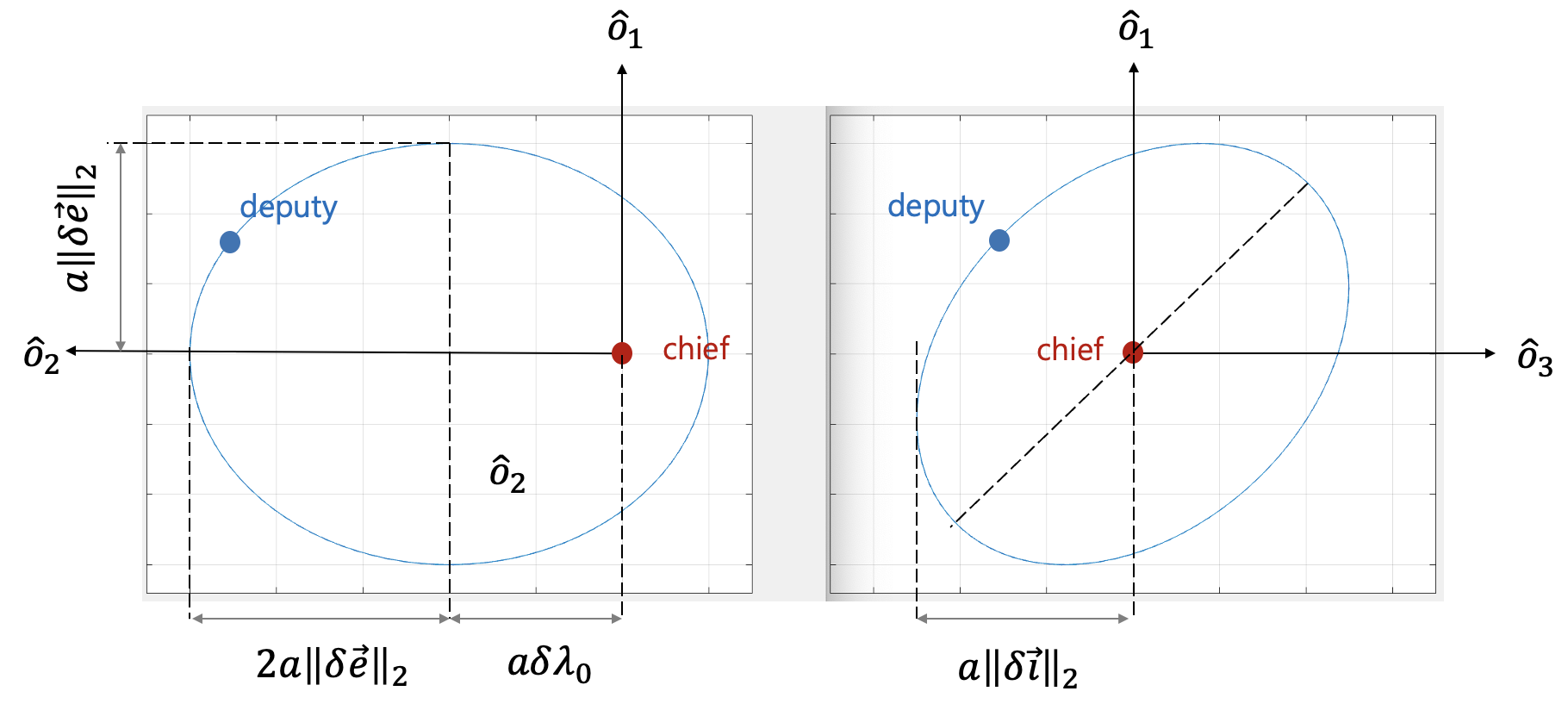 상대 궤도요소(ROE)를 Hill 좌표계의 \(\hat{o}_1-\hat{o}_2\) 평면(in-plane)과 \(\hat{o}_1-\hat{o}_3\) 평면(out-of-plane)에 나타내면 다음 그림과 같다.