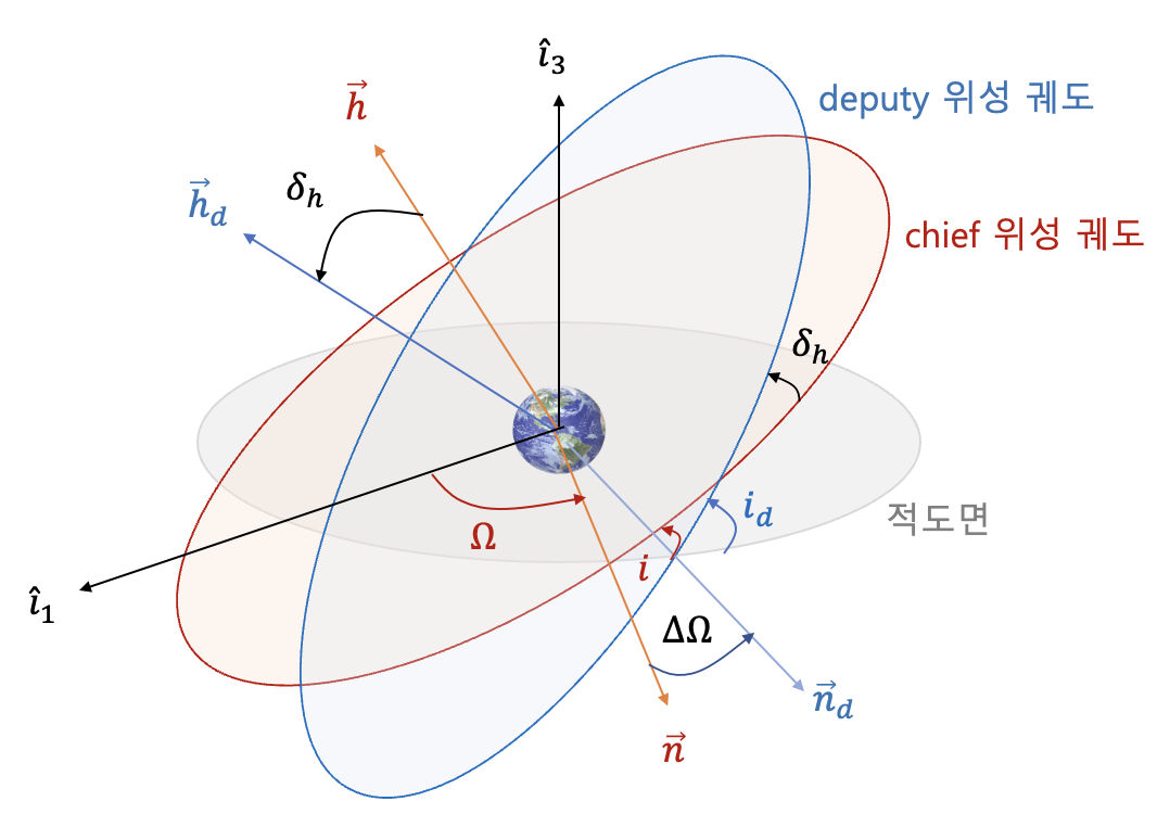 이 된다. 상대 경사각 벡터(relative inclination vector)의 정의와 비교해 보면 \(\delta_h\) 는 \(\lVert \delta \vec{i} \rVert_2\) 와 같다는 것을 알 수 있다. 따라서 \(\lVert \delta \vec{i} \rVert_2\) 는 chief 궤도면에 대한 deputy 궤도면의 기울어진 각을 의미한다.