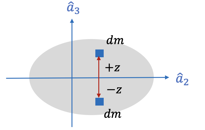 만약 \(xy\) 평면이 대칭 평면이면 좌표 \(x\) 및 \(y\) 에 대해 좌표 \(+z\) 및 \(-z\) 에 동일한 질량 요소가 있으므로, 이는 적분 함수에서 \(z\) 와의 관성곱이 사라진다는 것을 의미한다.