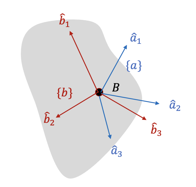 동일한 원점 \(B\) 를 갖고 강체에 고정된 두 좌표계 \(\{a\}\) 와 \(\{b\}\) 에 대해서 관성행렬의 변환 관계식은 다음과 같았다 (https://pasus.tistory.com/243).