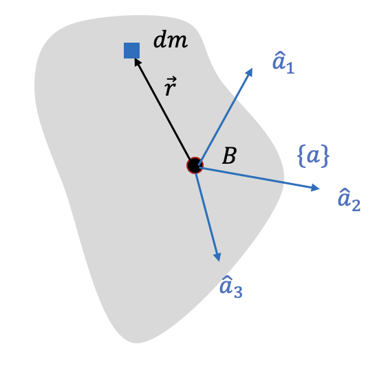 여기서 \(x, y, z\) 는 좌표계 \(\{a\}\) 의 원점에서 강체 내의 임의의 점까지의 위치 좌표이고, 즉 \(\vec{r}=x\hat{a}_1+y\hat{a}_2+z\hat{a}_z\), 행렬 \([I_B^a ]\) 의 구성 성분은 다음과 같이 주어진다.