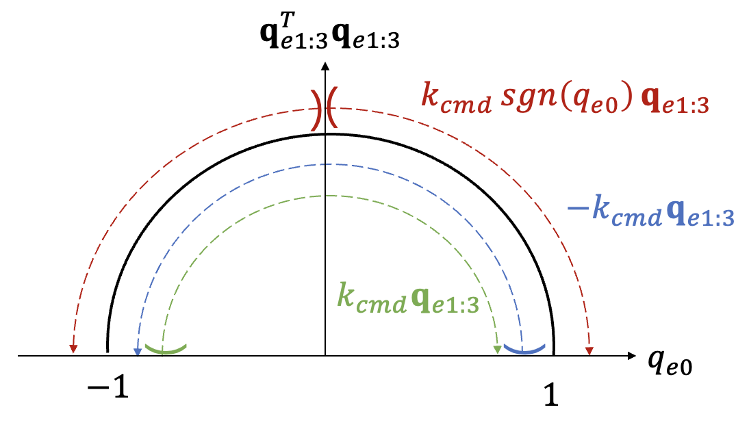 결국 \(\omega_{ib}^b=k_{cmd} \mathbf{q}_{e1:3}\) 와 \(\omega_{ib}^b=-k_{cmd} \mathbf{q}_{e1:3}\) 은 멀티콥터의 자세를 모두 물리적으로 동일한 자세인 \(\mathbf{q}_{cmd}\) 로 수렴시킴을 알 수 있다. 둘 사이의 차이는 전자는 쿼터니언 오차가 \(\mathbf{q}_I\) 로, 후자는 \(-\mathbf{q}_I\) 로 수렴한다는 것 밖에 없다.