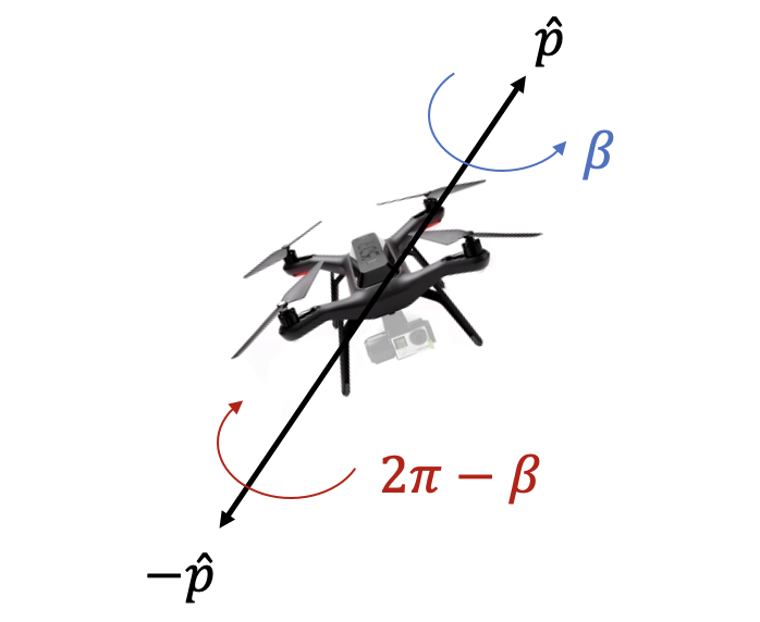 회전축 \(\hat{p}\) 를 중심으로 회전각 \(\beta\) 만큼 회전하거나, 회전축 \(-\hat{p}\) 를 중심으로 회전각 \(2\pi-\beta\) 만큼 회전하거나 물리적으로 같은 회전이다.