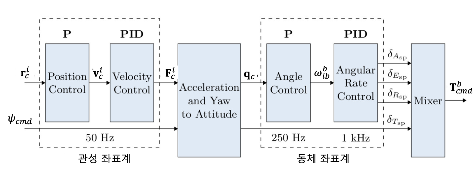 관성 좌표계 \(\{i\}\) 로 표현된 추력 벡터는 별도로 주어지는 방위각(azimuth angle) 명령 \(\psi_{cmd}\) 와 함께 자세 명령(attitude command) 계산 모듈로 보내져서 쿼터니언 \(\mathbf{q}_{cmd}\) 로 파라미터화된 자세 명령을 생성하게 된다.