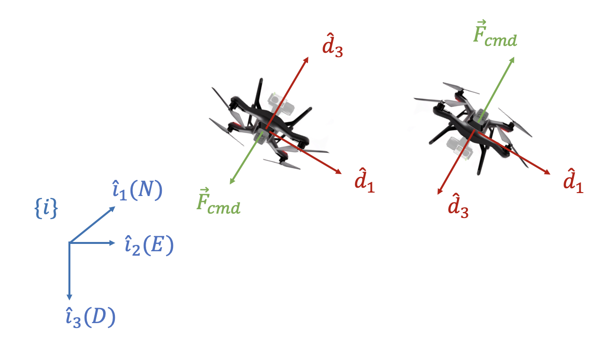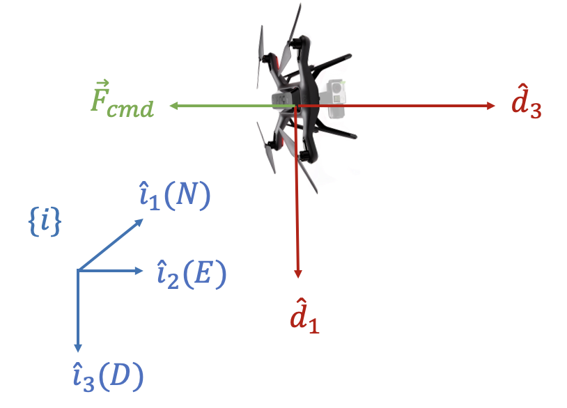 쿼터니언 \(\mathbf{q}_d^i\) 는 방향코사인행렬(DCM) \(C_d^i\) 를 계산한 후 변환하는 방법을 통해서 구하도록 한다. 먼저 좌표계 \(\{d\}\) 의 \(\hat{d}_3\) 축은 추력 벡터 \(\vec{F}_{cmd}\) 의 반대 방향이어야 하므로 \(\hat{d}_3\) 를 다음과 같이 정한다.
