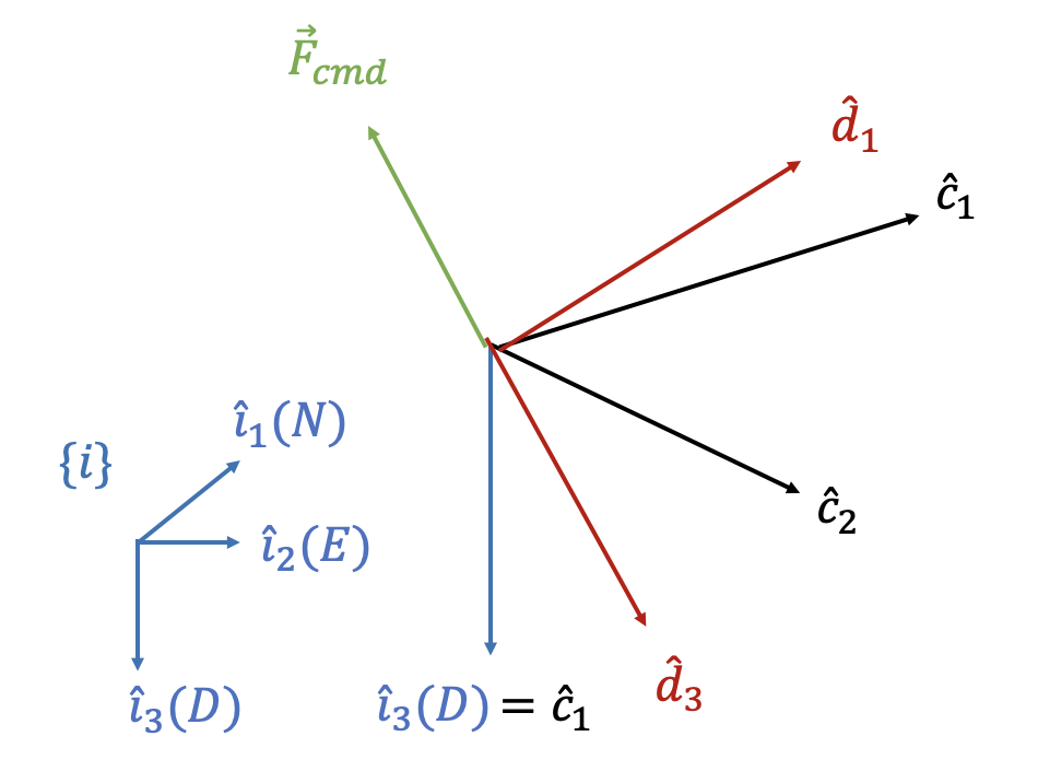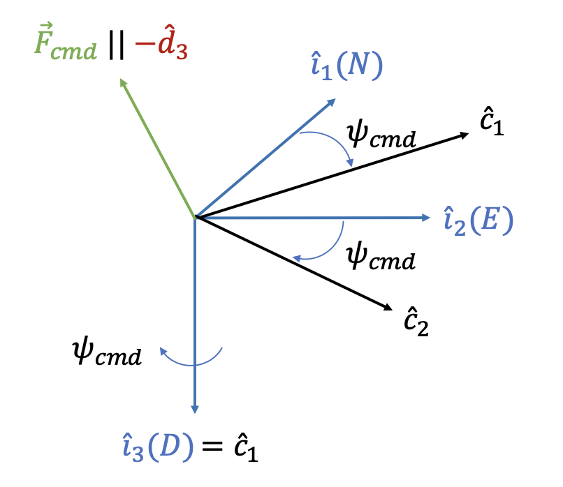 만약 추력이 \(0\) 이라면 \(\hat{d}_3=\hat{i}_3\) 로 놓는다. 또는 \(\mathbf{d}_3^i=[0 \ \ 0 \ \ 1]^T\) 로 놓는다. 방위각 명령 \(\psi_{cmd}\) 는 3-2-1 오일러각 좌표변환 방법에 의해서 주어지는 첫번째 각, 즉 관성 좌표계의 \(\hat{i}_3\) 축을 중심으로 한 회전각이므로 이를 반영하기 위해서 \(\hat{i}_3\) 축을 중심으로 \(\psi_{cmd}\) 만큼 좌표계 \(\{i\}\) 를 회전시킨다. 이 때 변환된 임시 좌표계 \(\{c\}\) 라고 하자.