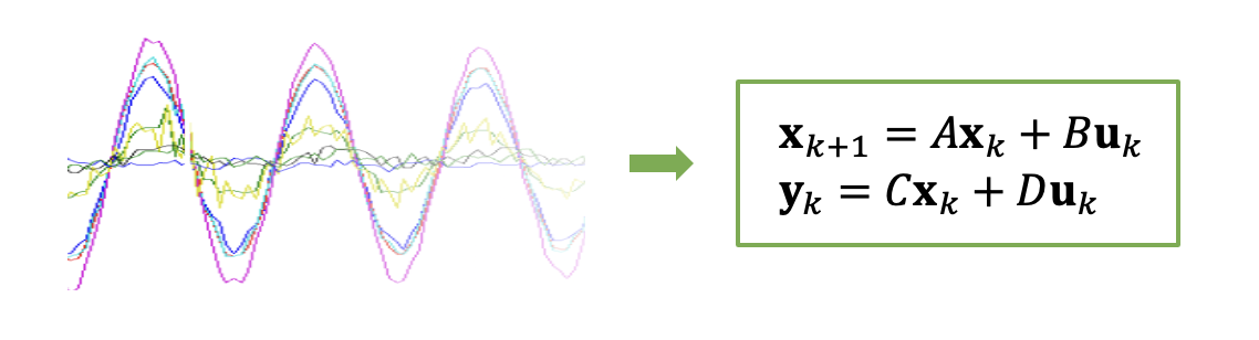 여기서 \(\mathbf{x}_k \in \mathbb{R}^n\), \(\mathbf{u}_k \in \mathbb{R}^p\), \(\mathbf{y}_k \in \mathbb{R}^q\), \( A \in \mathbb{R}^{n \times n}\), \(B \in \mathbb{R}^{n \times p}\), \(C \in \mathbb{R}^{q \times n}\), \(D \in \mathbb{R}^{q \times p}\) 이다.