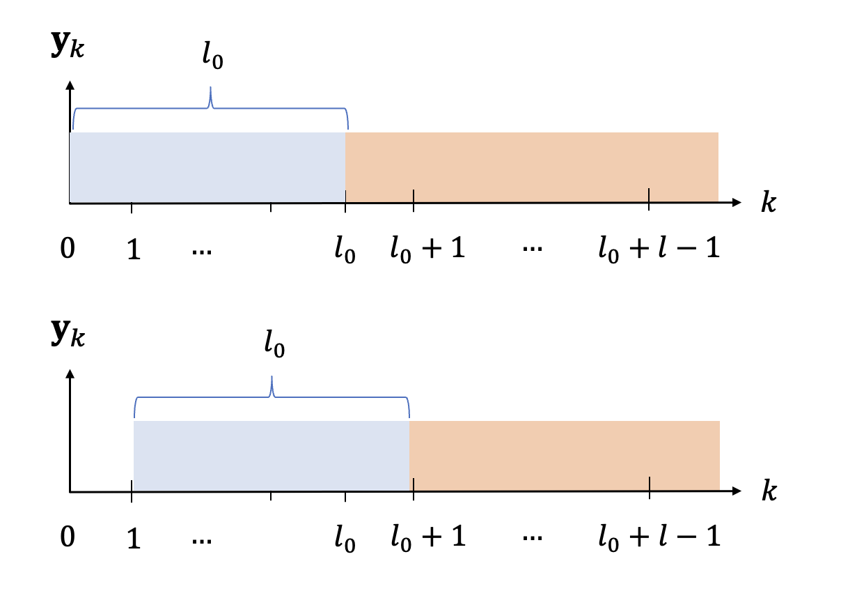 이제 \(i=0, 1, \cdots , l-1\) 에서 또는 시간스텝 \(k=l_0, l_0+1, \cdots , l_0+l-1\) 에서 식 (5)를 풀어 써보면 다음과 같다.
