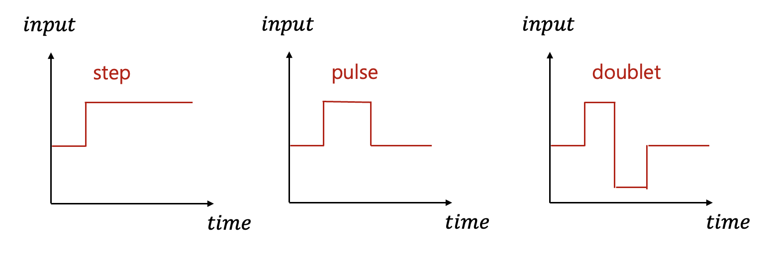 참고로 항공기 식별을 위한 비행 테스트에서는 스텝(step), 펄스(pulse) 또는 싱글렛(singlet), 더블렛(doublet) 등 세 가지 유형의 제어 입력이 많이 사용된다.