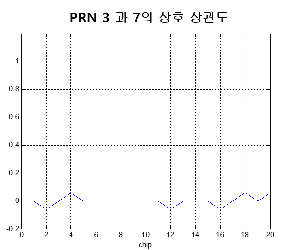 다음 그림은 PRN3의 자기 상관도와 PRN3와 PRN7 신호의 상호 상관도를 그린 것이다. 모든 구간에서 값이 거의 0인 것을 알 수 있다.