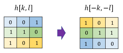 다음 그림은 2D 컨볼루션과 상관도의 계산상 차이점을 보여준다. 컨볼루션의 경우 신호의 ‘이동’ 전에 ‘뒤집기’를 먼저해야 한다.