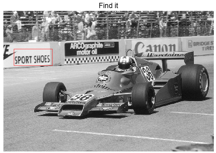 그 부분을 원래 이미지에 빨강색 박스로 표시해 보면, 상호 상관도가 레이싱카 이미지에서 ‘SPORT SHOES’라는 광고판의 위치를 정확히 판별할 수 있음을 알 수 있다.