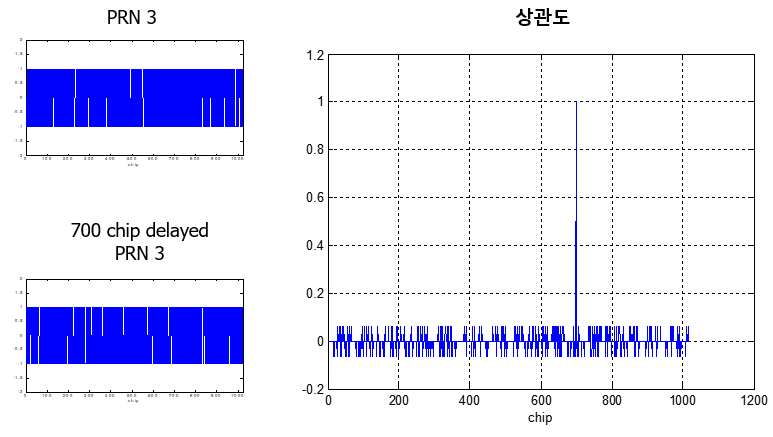 아래 그림은 GPS에서 생성한 PRN3 신호, 위성에서 수신하여 전송 시간인 700 chip 만큼 지연(delay)된 PRN3 신호와, 두 신호 사이의 자기 상관도를 보여준다. 정확히 700 chip에서 상관도가 제일 큰 값을 가지며 그 외에서는 상관도 값이 거의 0을 유지하는 것을 볼 수 있다.