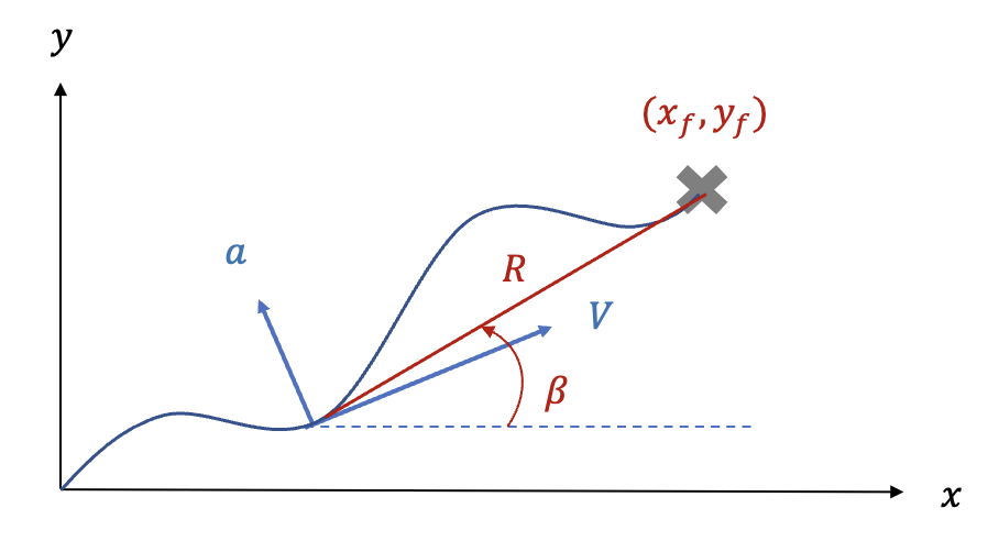 제어 목적은 출발지에서 출발하여 비행 시간 \(t_f\) 가 경과한 후 목적지에 최소의 에너지를 사용하여 비행체를 목적지 \( (x_f, \ y_f)\)에 도착시키는 것이다. 그림에 비행체와 목적지, 출발지 간의 기하학적인 관계가 나와 있다.