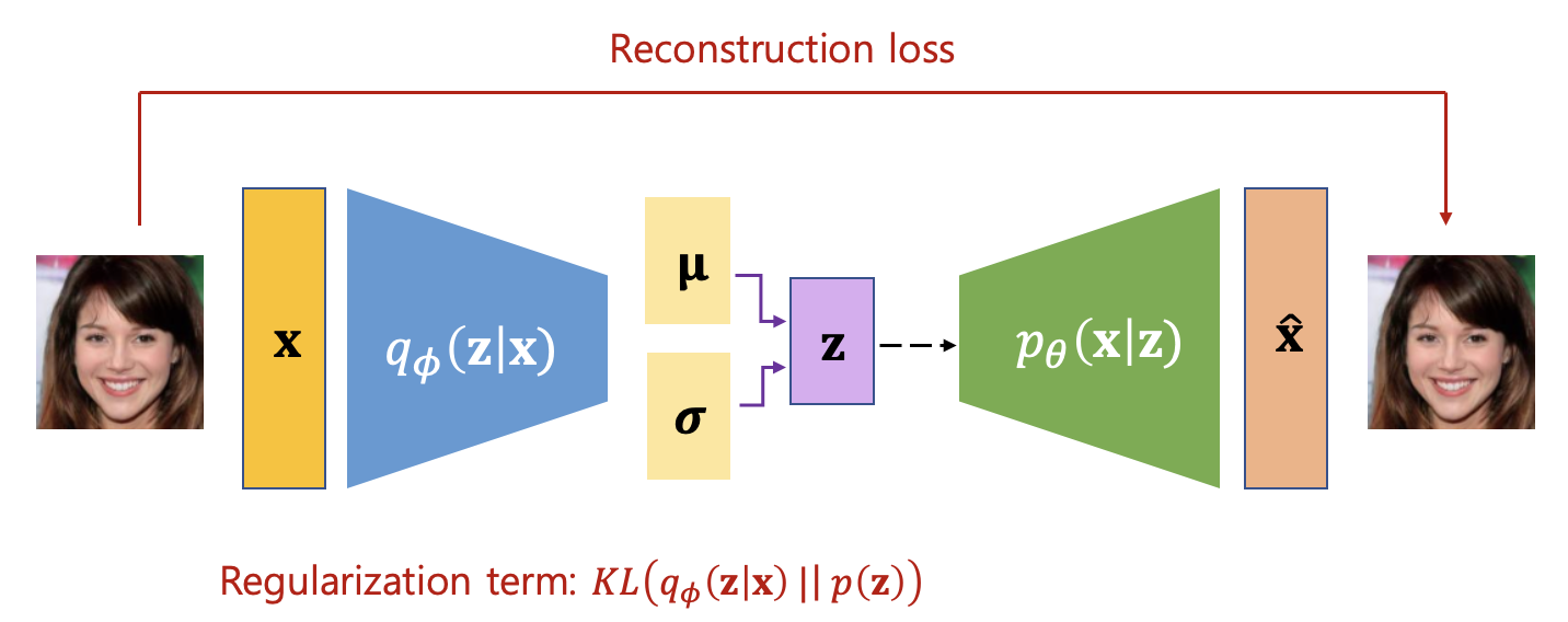 식 (9)에서 두번째 항은 인코더(encoder) 부분의 손실함수 항으로서 정규화 항(regularization term)이라고 하는데 잠재변수의 확률밀도함수 \(p(\mathbf{z})\) 와 파라미터 \(\phi\) 로 표현되는 확률밀도함수 \(q_\phi (\mathbf{z} \vert \mathbf{x})\) 가 같을 때 최소가 된다. 따라서 \(p(\mathbf{z})\) 를 정규분포로 정했기 때문에 \(q_\phi (\mathbf{z} \vert \mathbf{x})\) 도 정규분포가 되도록 파라미터 \(\phi\) 를 구하는 것이 필요하다. \(q_\phi (\mathbf{z} \vert \mathbf{x})\) 를 정규분포가 되도록 만든다는 의미는 데이터를 입력으로 받았을 때 나타나는 잠재변수의 분포를 정규분포가 되도록 파라미터 \(\phi\) 를 계산한다는 것이다.