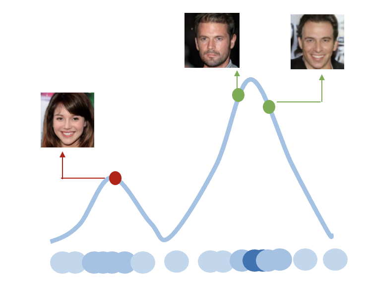 만약 데이터의 확률분포 \(-\) 데이터가 이산적일 경우는 확률질량함수(probability mass function), 연속적일 경우는 확률밀도함수(probability density function) \(-\) 를 알 수 있으면 샘플링을 통해서 본래 데이터와 같은 확률적 특성을 갖는 새로운 데이터를 임의로 생성할 수 있으므로, 생성모델의 목적은 데이터의 확률분포를 추정하는 것이라고 말할 수 있다. 예를 들면 데이터로서 얼굴 이미지 집합이 주어졌을 때, 그 이미지의 특성을 나타내는 확률밀도함수를 추정할 수 있다면, 새로운 얼굴 이미지를 임의로 생성할 수 있다는 말이다.