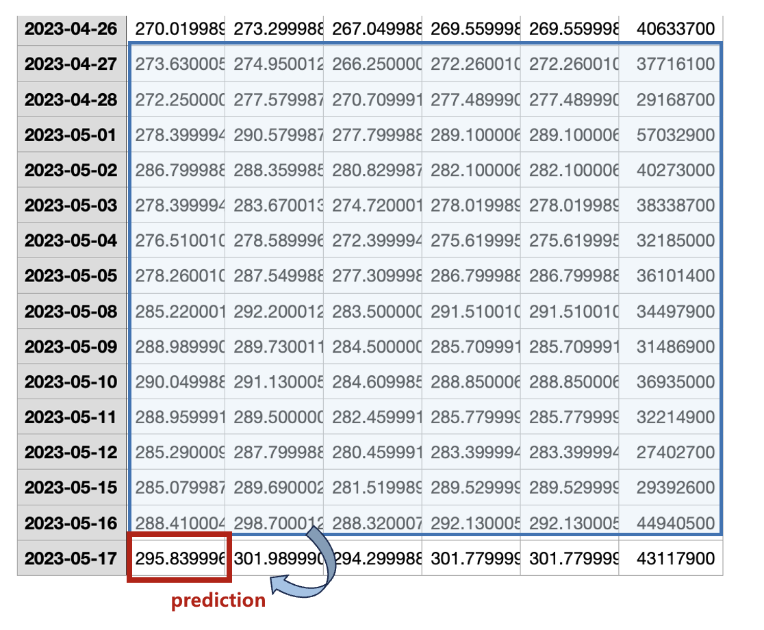 주가 예측은 예측일 적전 14일간의 Open, High, Low, Close, Volume를 기반으로 당일의 시가(Open)를 예측하는 것을 목표로 한다.