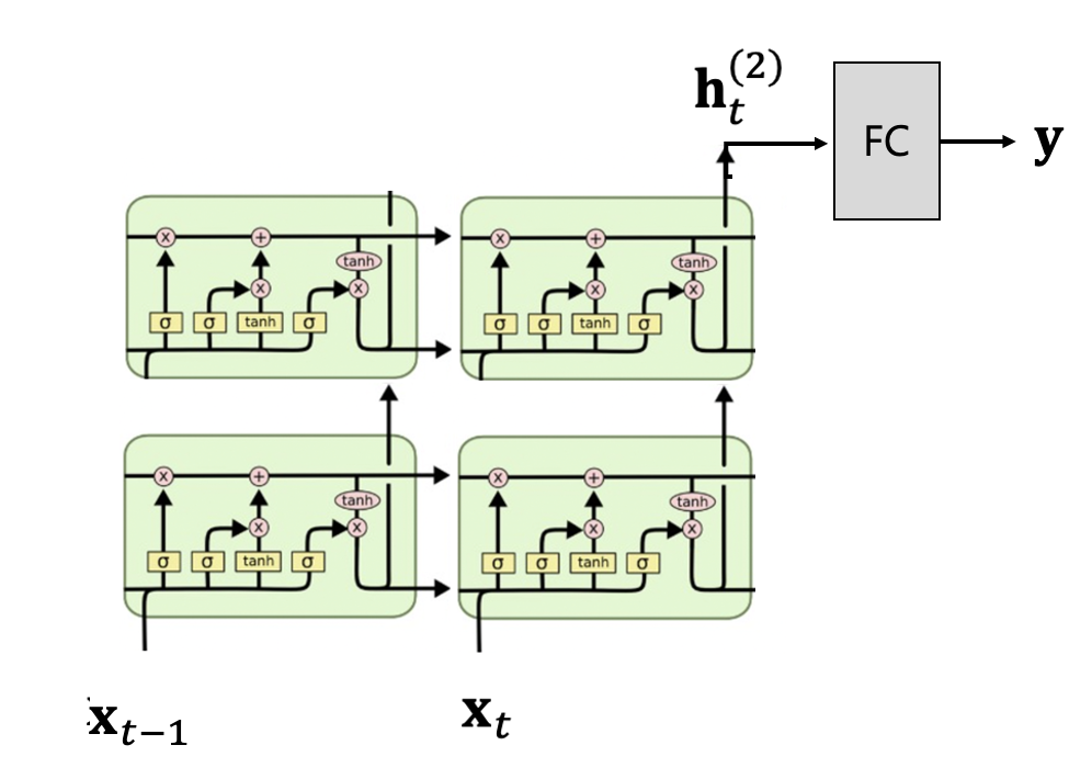 LSTM 모델은 다음과 같이 2층으로 된 stacked LSTM으로 한다. 시퀀스 길이는 14이고 1층의 은닉 상태변수의 차원은 \(\mathbf{h}_t^{(1)} \in \mathbb{R}^{64}\), 2층의 은닉 상태변수 차원은 \(\mathbf{h}_t^{(2)} \in \mathbb{R}^{32}\), 입력 변수의 차원은 \(\mathbf{x}_t \in \mathbb{R}^5\) 이다. 1층은 모든 시퀀스에서 은닉 상태를 출력해야 하기 때문에 return_sequences=True 를 사용하고, 2층은 마지막 시퀀스에서만 출력이 필요하기 때문에 이 속성을 사용하지 않는다. LSTM의 출력에 사이즈가 1인 완전연결(FC) 레이어가 연결되어 있다.