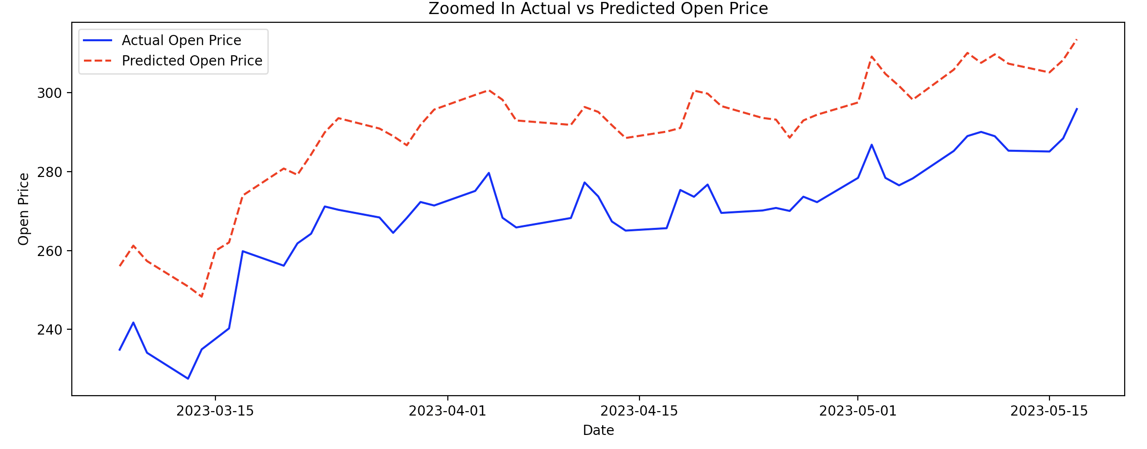 plt.title('Zoomed In Actual vs Predicted Open Price')