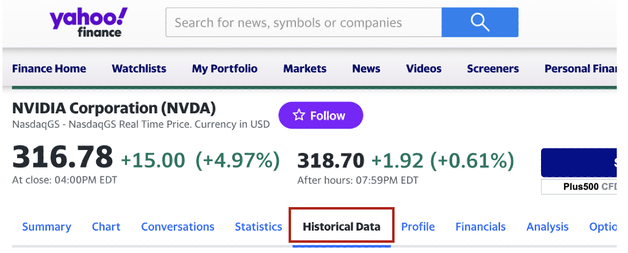 예를 들어 특정 기간의 엔비디아 주식 데이터를 다운로드 받으면 다음과 같이 Date, Open, High, Low, Close, Adj Close, Volume 등의 데이터가 CSV 포맷으로 나온다.