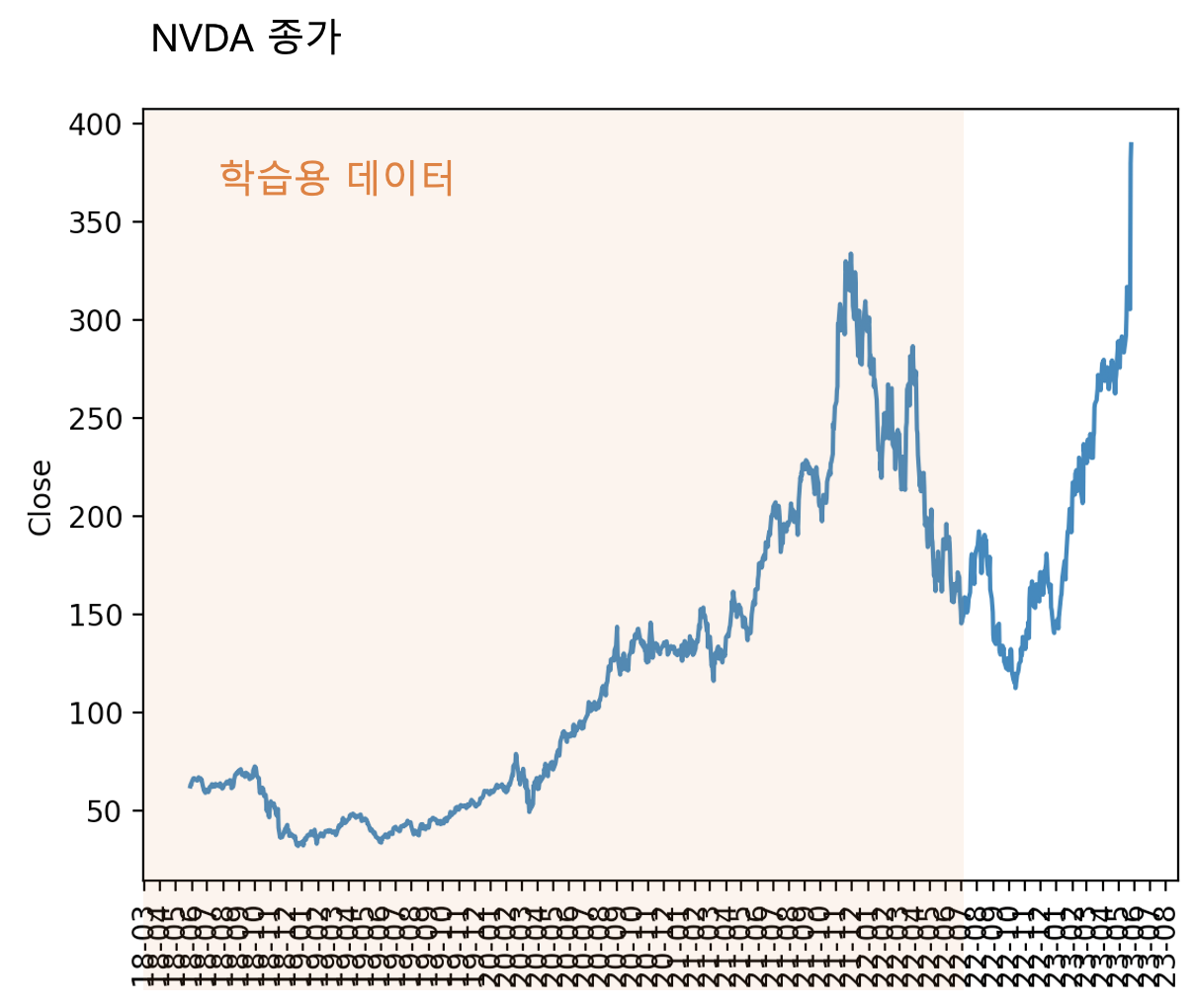 데이터는 지난 5년간의 엔비디아 주식의 종가(close)다. 이 중 2018년5월 29일부터 2022년 6월 30일까지의 종가는 정상적인 데이터로 간주하여 LSTM-AE의 학습에 사용하고, 2022년 7월 1일부터 2023년 5월 26일까지의 데이터는 이상 신호 검출용 데이터로 사용한다. 가만 살펴보니 불과 며칠 사이에 엔비디아 주가가 많이 올라서 신고가를 찍은 듯 하다 (살 걸..).