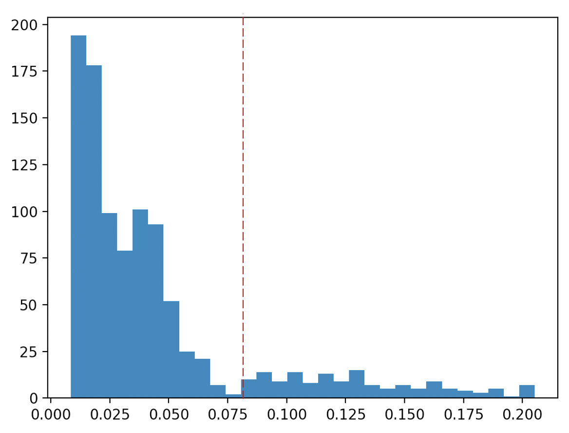 오차가 대략 0.08 이하에 몰려 있는 것으로 판단되어 이상 탐지를 위한 임계치(threshold)를 0.08로 설정하고, 2022년 7월 1일 이후의 종가 데이터를 LSTM-AE 모델에 입력해 봤다. 결과는 다음과 같다.