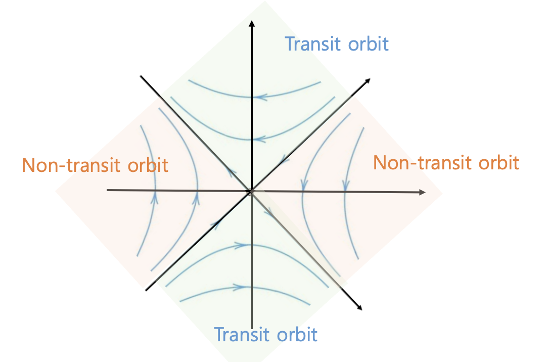 추가적으로 안장점 투사 그림에 의하면 라그랑지 포인트 주변 영역을 통과(transit)하는 궤도와 통과하지 않는 비통과(non-transit) 궤도도 존재함을 알 수 있다.