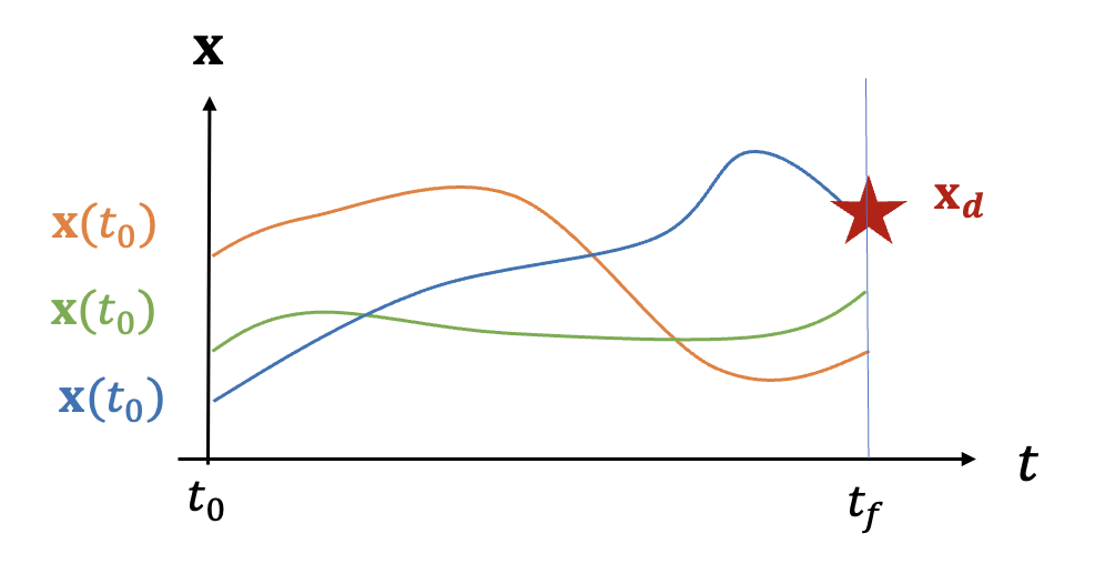 을 이용하여 위 프로세스를 반복하면 \(\mathbf{x}(t_f )= \mathbf{x}_d\) 가 되는 초기값 \(\mathbf{x}(t_0 )\) 를 계산해 낼 수 있다.