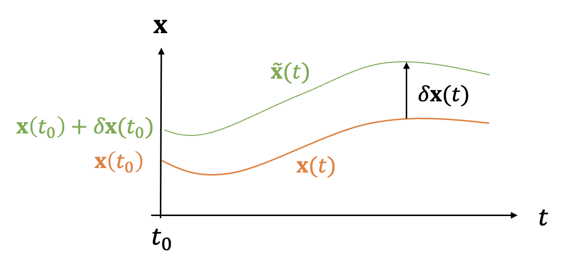 초기값 \(\mathbf{x}(t_0 )\) 일 때 식 (1)의 해 또는 궤적을 \(\mathbf{x}(t)\) 로 표현하자. 또한 원래 초기값에 섭동을 준 새로운 초기값 \(\mathbf{x}(t_0 )+\delta \mathbf{x}(t_0 )\) 에서 시작된 궤적을 \(\tilde{\mathbf{x}}(t)\) 로 표현하자.