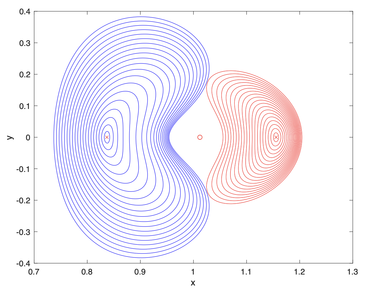 다음은 선형화 방정식으로 리야프노프 궤도의 초기값을 획득한 후, x 좌표값을 \(0.001\) 씩 더해 가면서 계산한 지구-달 시스템의 L1과 L2 포인트 리야프노프 궤도들의 집합이다.