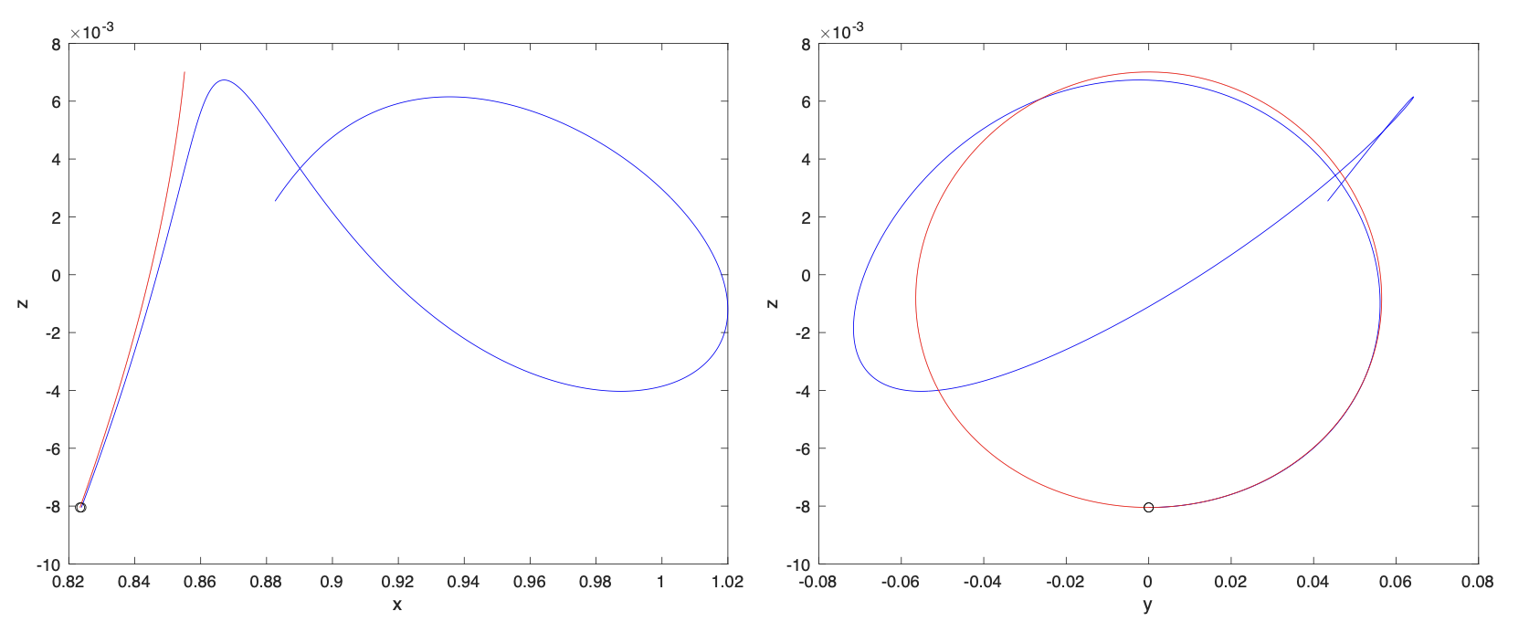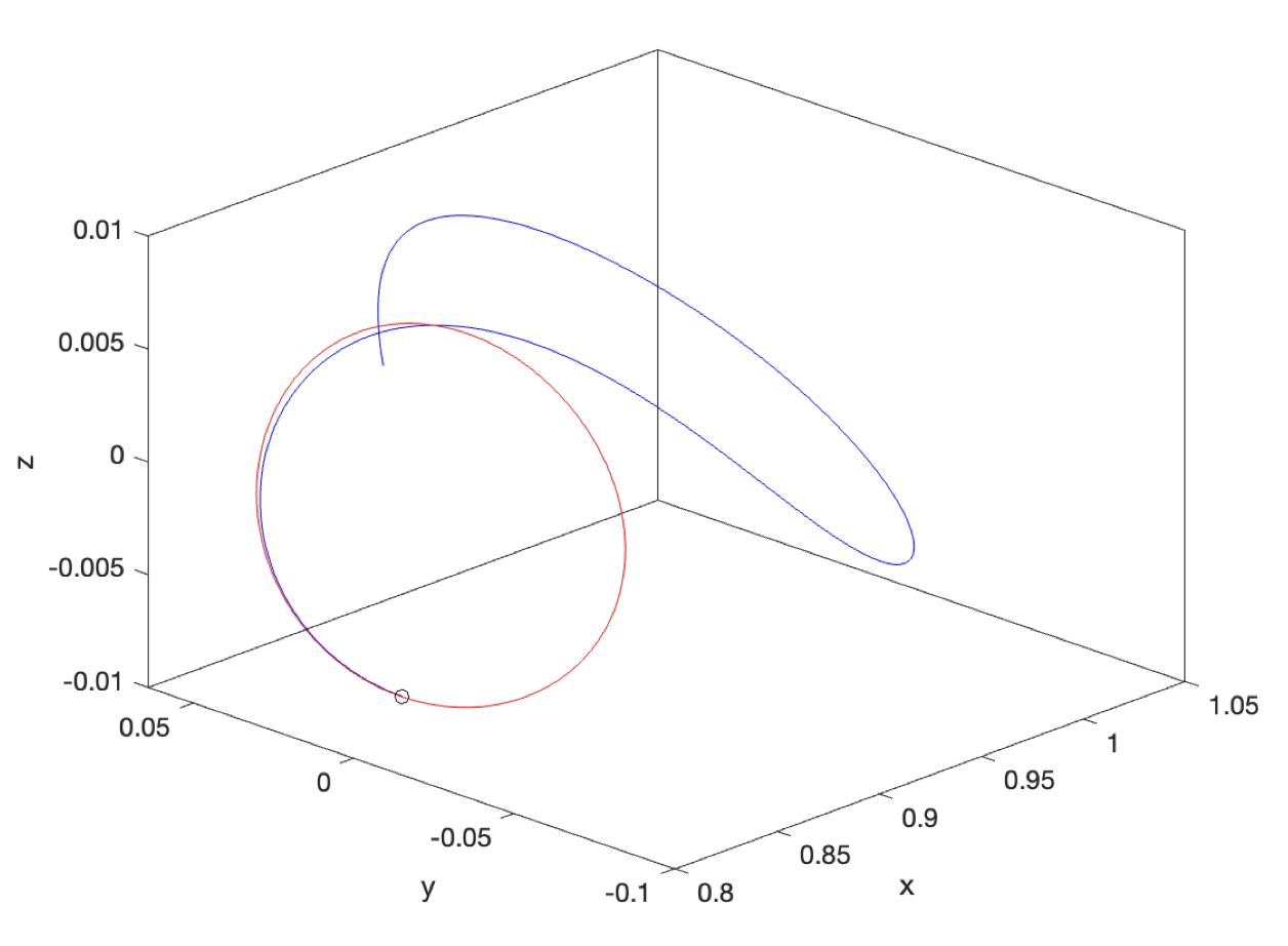 다음 그림은 \(A_z=0.05\) 로 지정했을 때 Richardson의 3차 근사식 기반 초기조건의 추측값과 미분보정을 통한 초기값을 이용하여 궤도를 시뮬레이션 한 것이다. 미세한 초기조건의 차이가 주기궤도의 구현 여부를 결정함을 알 수 있다.