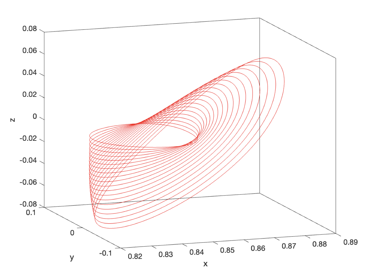 다음 그림은 \(A_z=0.001\) 부터 \(A_z=0.5\) 까지 변화해 가면서 계산한 지구-달 시스템의 L1 포인트 헤일로 궤도들의 집합이다. \(A_z\) 가 작을 때는 리야프노프 궤도와 비슷하지만 \(A_z\) 가 클 수록 (x-y) 평면 밖으로 큰 편위를 갖는다는 것을 알 수 있다.