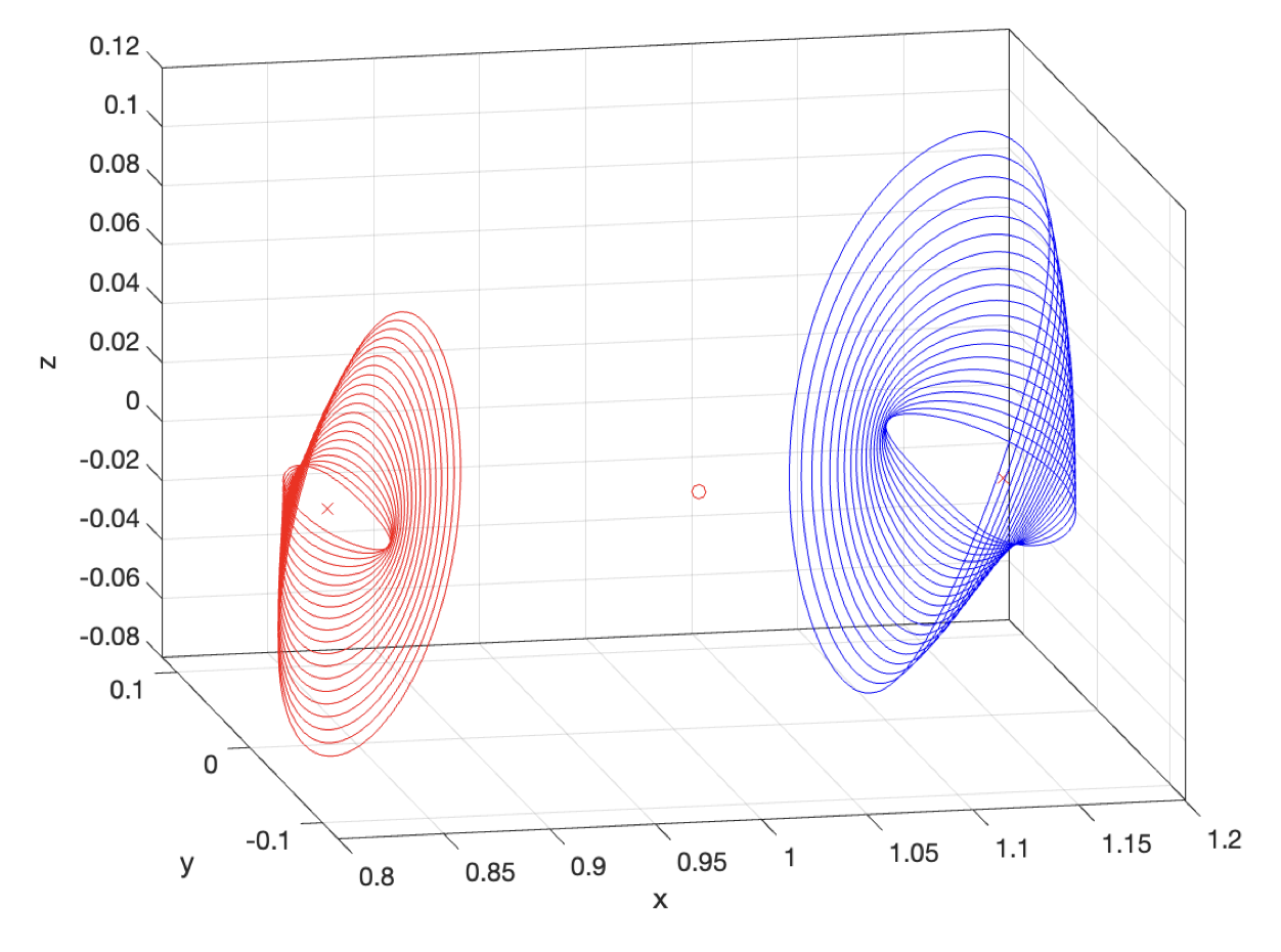 다음 그림은 지구-달 시스템의 L1 과 L2 포인트 헤일로 궤도들의 집합을 함께 그린 것이다.