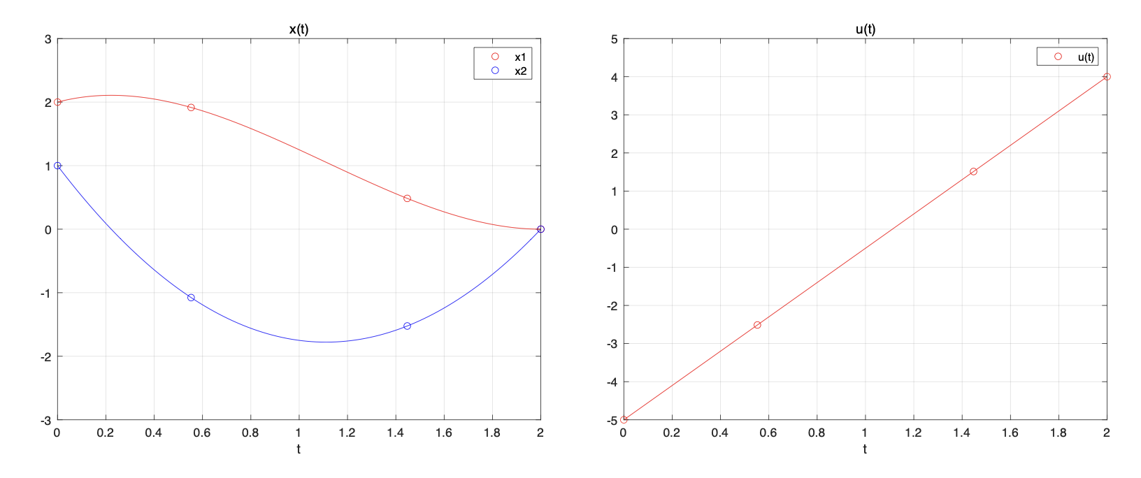 아래 그림은 라그랑지 보간 다항식을 이용하여 상태변수와 제어입력의 반응을 그린 것이다. 해석적으로 구한 상태변수와 제어입력의 반응과 일치함을 알 수 있다.