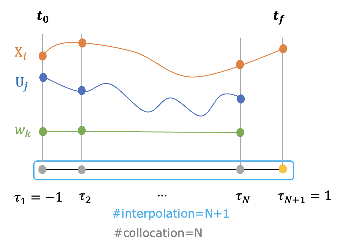 라다우 유사 스펙트럴 방법(RPM, Radau pseudospectral method)에서는 \(N\) 개의 LGR(Legendre-Gauss-Radau) 포인트를 콜로케이션 포인트로 사용하고, LGR 포인트에 \(\tau_{N+1}=1\) 점을 포함한 것을 보간점으로 사용한다.