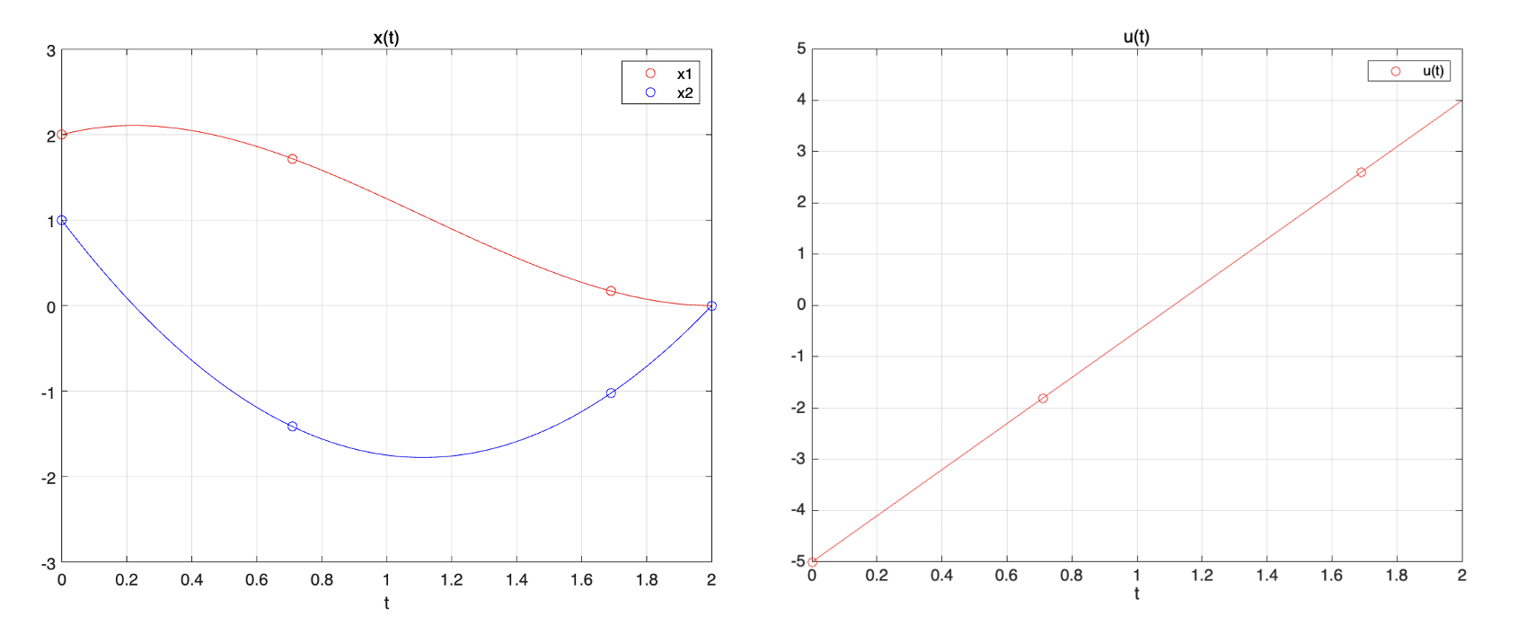 아래 그림은 라그랑지 보간 다항식을 이용하여 상태변수와 제어입력의 반응을 그린 것이다. 해석적으로 구한 상태변수와 제어입력의 반응과 일치함을 알 수 있다.