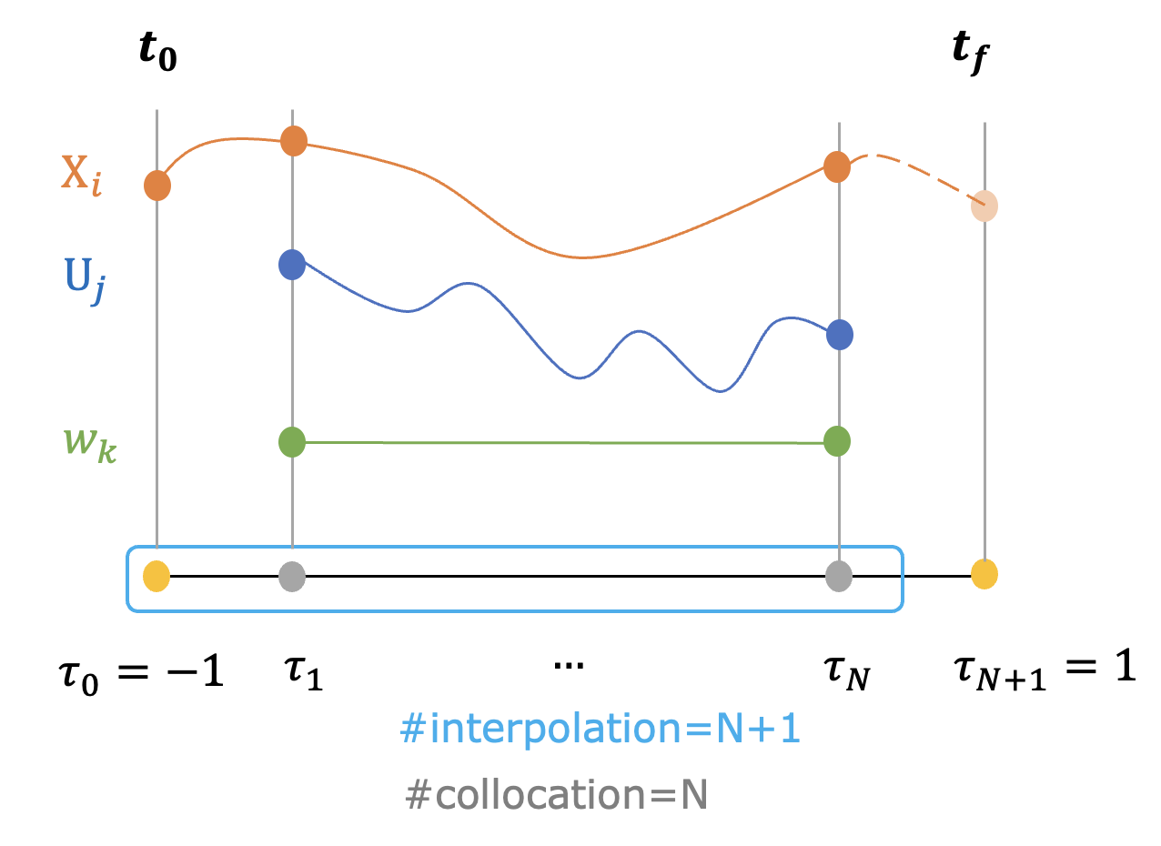 가우스 유사 스펙트럴 방법(GPM, Gauss pseudospectral method)에서는 \(N\) 개의 LG(Legendre-Gauss) 포인트를 콜로케이션 포인트로 사용하고, LG 포인트에 \(\tau_0=-1\) 을 포함한 점을 보간점으로 사용한다. 이산화 점은 보간점에 \(\tau_{N+1}=1\) 을 포함한 것이다. 따라서 가우스 유사 스펙트럴 방법은 \(N\) 개의 콜로케이션 포인트, \(N+1\) 개의 보간점와 \(N+2\) 개의 이산화 점을 사용한다.
