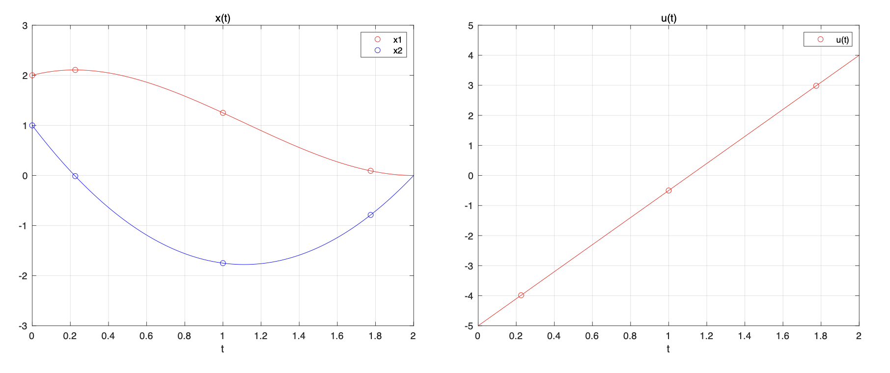아래 그림은 라그랑지 보간 다항식을 이용하여 상태변수와 제어입력의 반응을 그린 것이다. 해석적으로 구한 상태변수와 제어입력의 반응과 일치함을 알 수 있다.