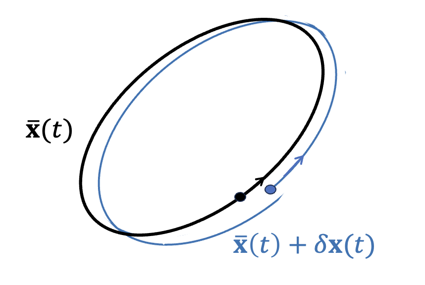 \[ \delta \mathbf{x}(t)= \dot{\bar{\mathbf{x}}}(t)= \mathbf{f}( \bar{\mathbf{x}}(t)) \tag{30} \]