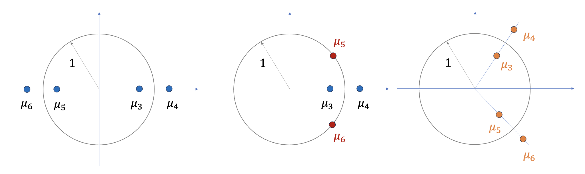 주기궤도의 안정성은 \(\mu_3, \ \mu_4, \ \mu_5, \ \mu_6\) 에 의해서 결정된다. 고유값은 서로 역수의 관계에 있으므로 한 고유값이 안정하다면 다른 고유값은 불안정하다. 하지만 모든 고유값이 단위 원(unit circle)상에 있는 결레복소수라면 궤도는 안정하다.