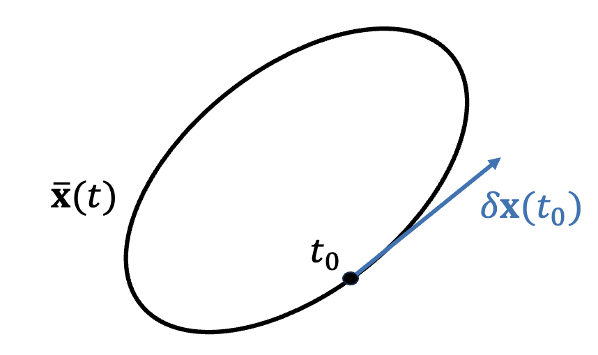 \[ \begin{align} & \dot{\bar{\mathbf{x}}} (t)+ \delta \dot{\mathbf{x}}(t) \approx \mathbf{f}( \bar{\mathbf{x}}(t))+ \left. \frac{ \partial \mathbf{f}}{\partial \mathbf{x} } \right\vert_{\bar{\mathbf{x}}(t) } \delta \mathbf{x}(t) \\ \\ \to \ & \delta \dot{\mathbf{x}}(t)=A(t) \delta \mathbf{x}(t) \tag{2} \end{align} \]