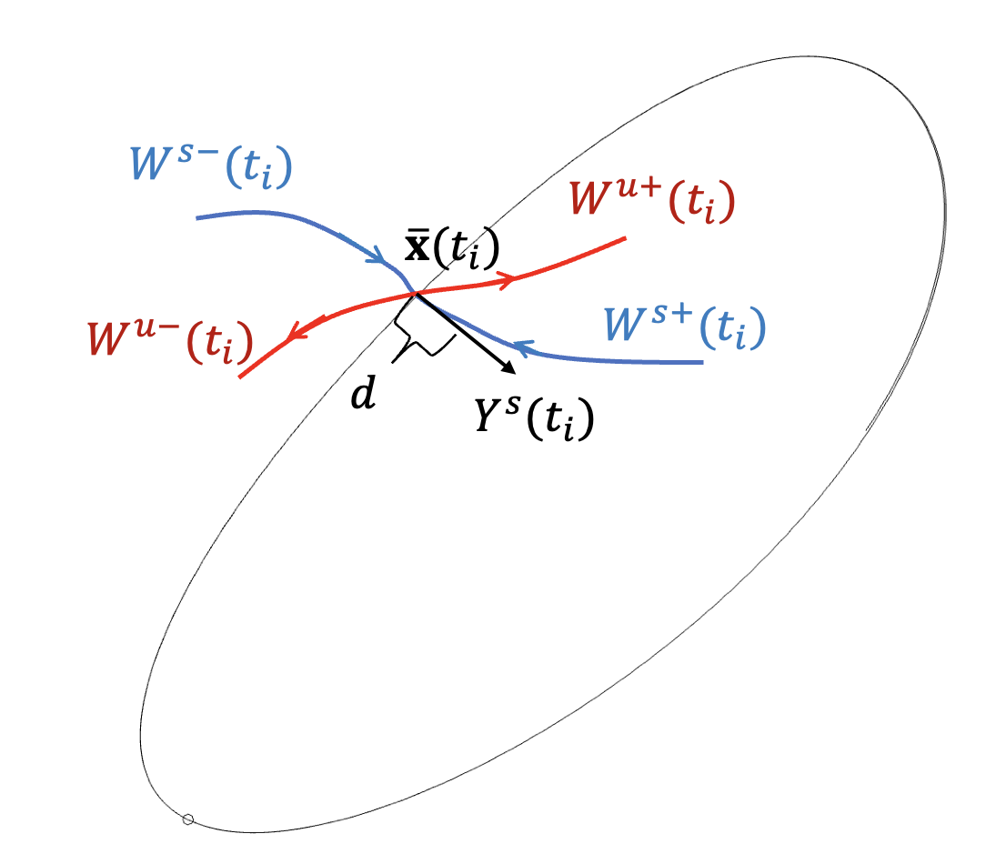 여기서 \(d\) 는 주기궤도로부터의 섭동량이다. \(d\) 의 크기는 선형화 가정의 범위내에 있을 만큼 작야야 하지만 너무 작으면 매니폴드 계산시간이 길어질 수 있다. 어떤 연구에 의하면 \(Y^s (t_i )\) 와 \(Y^u (t_i )\) 대신에 고유벡터의 위치 성분만으로 정규화한 안정 및 불안정 고유벡터 \(V^s (t_i )\) 와 \(V^u (t_i )\) 를 사용하기도 한다.