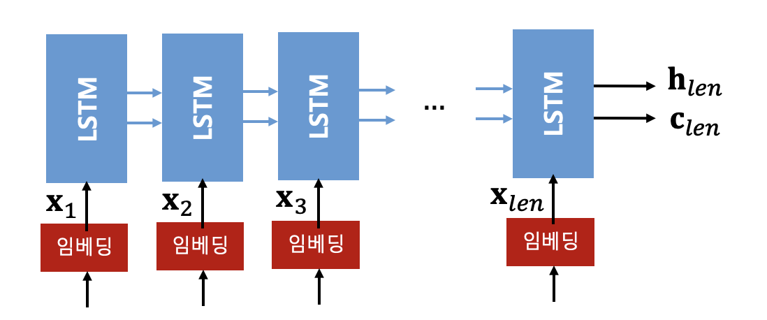 return_state = True 를 한 경우에는 마지막 시퀀스에서의 출력(은닉상태), 은닉상태 \(\mathbf{h}_{len}\) 와 셀상태(cell state) \(\mathbf{c}_{len}\) 값이 출력된다. \([\mathbf{h}_{len}, \ \mathbf{c}_{len}]\) 가 인코더의 출력으로서 컨텍스트 벡터가 되며 이것이 디코더의 초기 은닉상태와 셀상태로 전달된다.