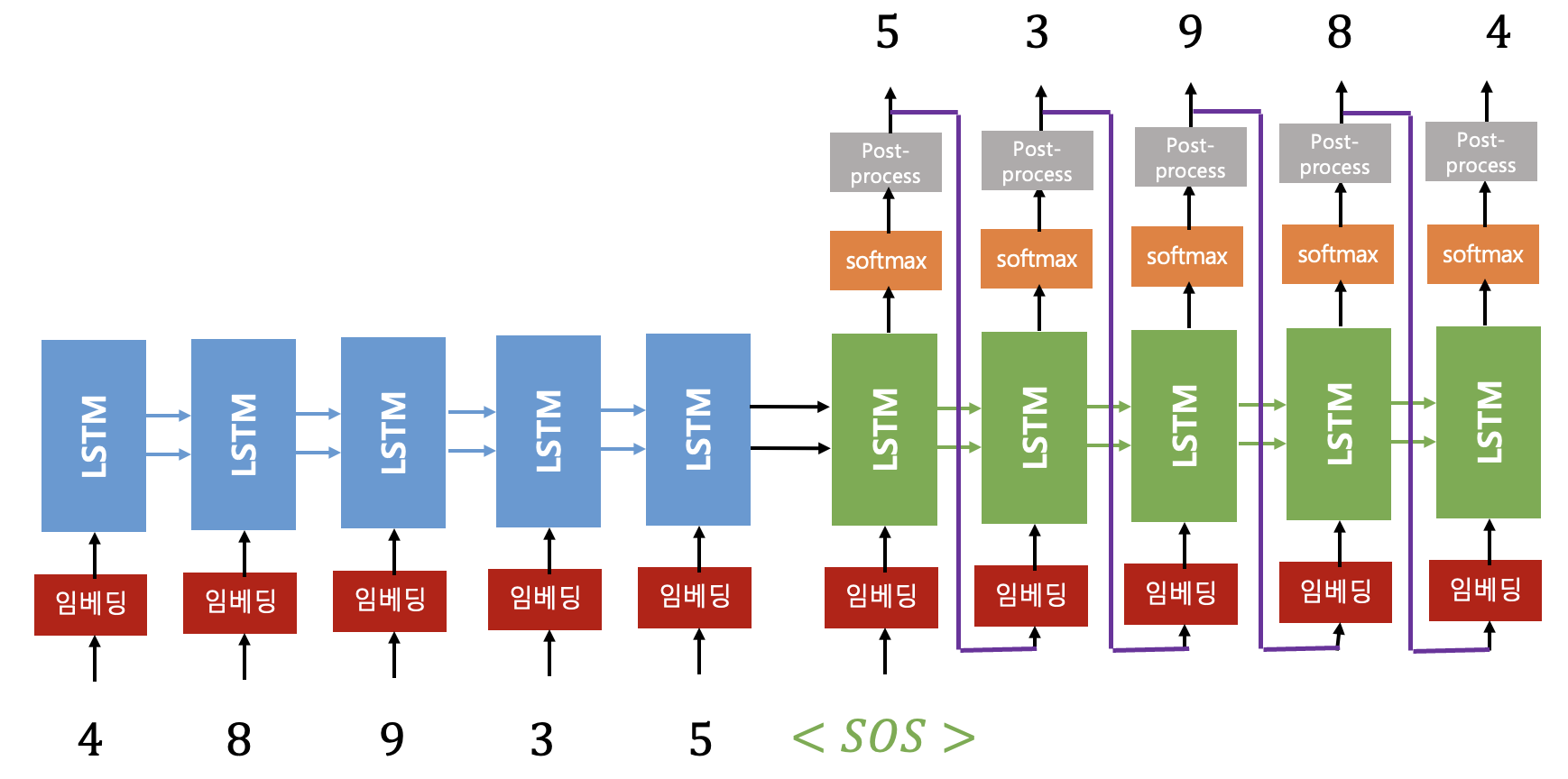 학습이 끝나고 실행단계는 다음과 같이 작동한다. 시퀀스 \([4, \ 8, \ 9, \ 3, \ 5]\) 를 seq2seq 의 입력으로 넣어서 출력값을 생성하고자 한다. 그러면 인코더 입력 시퀀스는 다음과 같다.