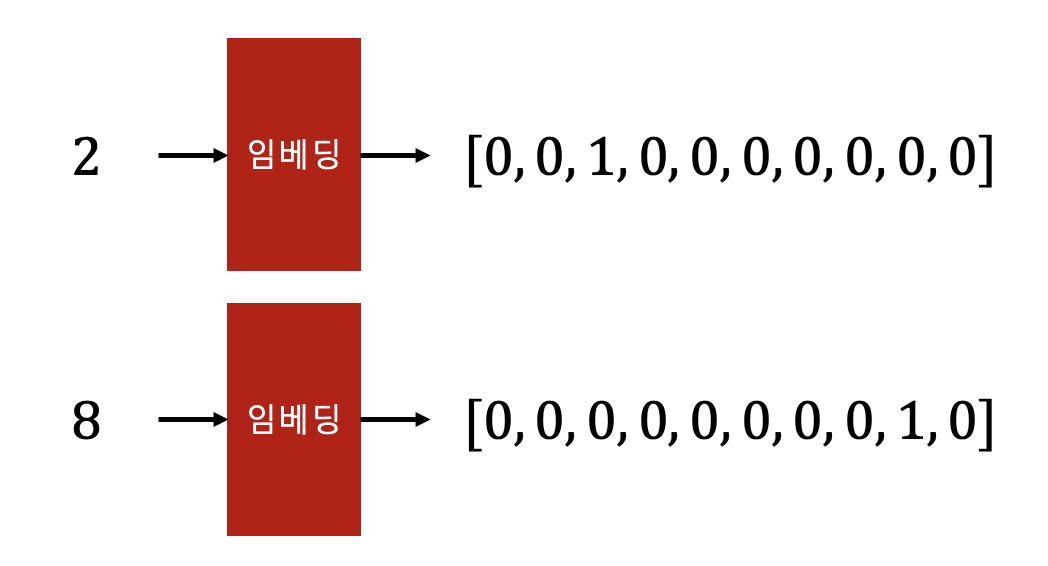 먼저 인코더 임베딩(embedding) 레이어가 있다. 인코더 임베딩 레이어는 입력 시퀀스의 각 성분(기계번역에서는 입력 문장의 단어에 해당)을 임베딩 벡터로 변환한다. 여기서는 길이가 10인 원핫(one-hot) 벡터로 변환한다. 예를 들면 \(2\) 는 \([0, 0, 1, 0, 0, 0, 0, 0, 0, 0]\) 로, \(8\) 은 \([0, 0, 0, 0, 0, 0, 0, 0, 1, 0]\) 로 변환한다.