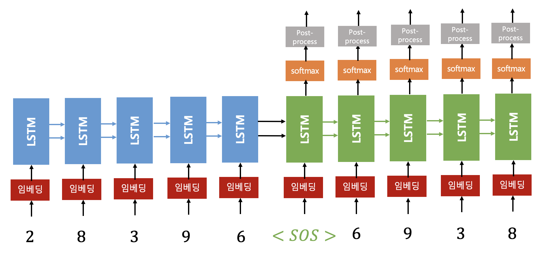 구현하고자 하는 예제는 다음과 같이 0~9 범위를 갖는 seq_len 길이(그림에서는 길이가 5)의 입력 숫자열을 반대 순서로 정렬된 숫자열로 변환하여 출력시키는 것이다. 본 예제에서는 인코더와 디코더 모델로 각각 단방향, 단층 LSTM을 사용한다.