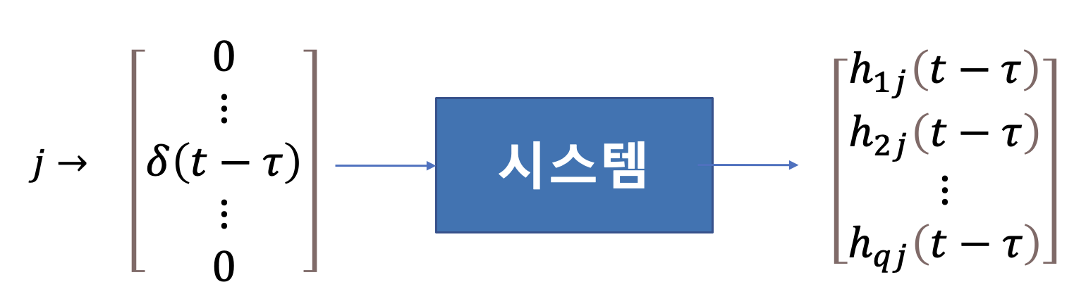 여기서 \(h_{ij} (t-\tau)\) 는 다른 입력단에서의 입력값이 모두 \(0\) 이고 시간 \(\tau\) 에서 \(j\) 번째 입력단에만 임펄스가 가해졌을 때 시간 \(t\) 에서 \(i\) 번째 출력단에서의 반응을 나타낸다.