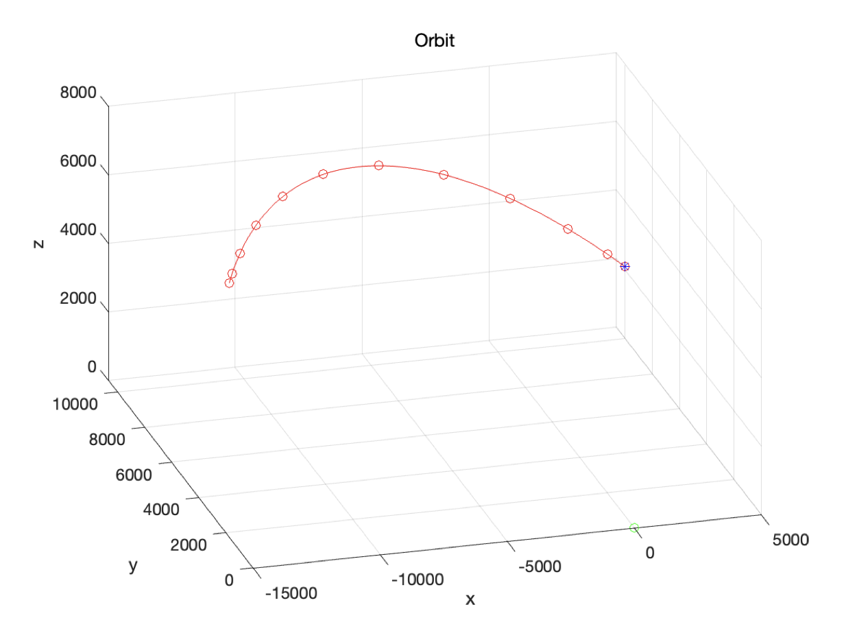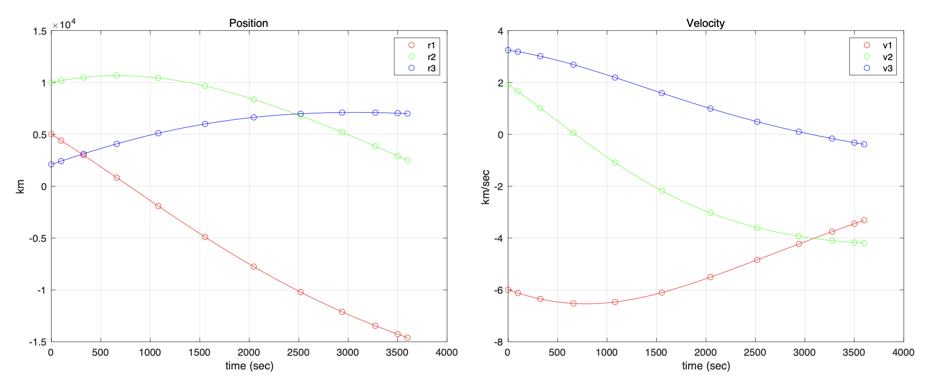\[ \begin{align} & \mathbf{r}_0= \begin{bmatrix} 5,000 & 10,000 & 2,100 \end{bmatrix}^T \ km \\ \\ & \mathbf{r}_f= \begin{bmatrix} -14,600 & 2,500 & 7,000 \end{bmatrix}^T \ km \\ \\ & t_f-t_0=3,600 \ sec \ \ (1 \ hr) \\ \\ & \mu =398,600 \ km^3 / s^2 \\ \\ & R= 6,378 \ km \ \ \mbox{(Earth radius)} \end{align} \]